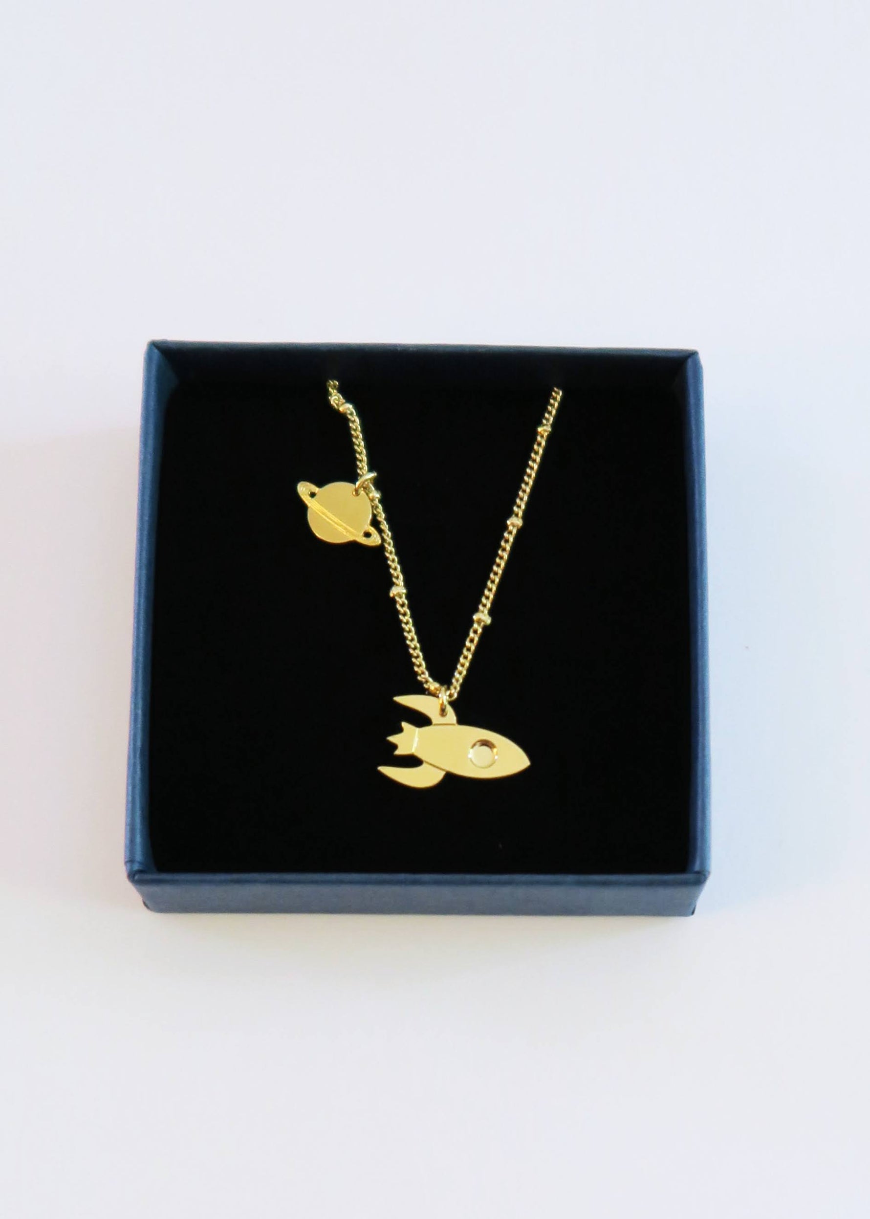 Collier minimaliste en métal doré à l'or fin représentant une fusée et la planète saturne.